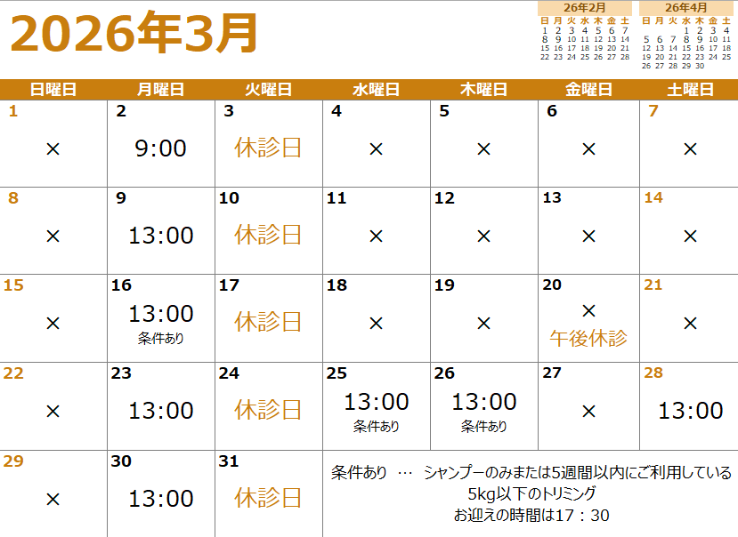 平素は当院をご利用いただき、誠にありがとうございます。トリミングとシャンプーの予約状況をお知らせします。